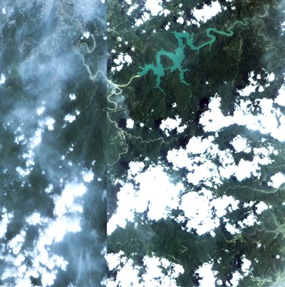 福爾摩沙衛星二號8月11日所拍攝到南勢溪(圖中兩條細黃色分岔處)影像,初步比對蘇迪勒颱風侵襲前,可至少看見兩處新增崩塌。圖/資料照片