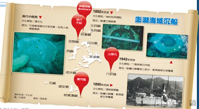 中研院研究團隊94年起在澎湖海域發現11處沉船標的物,包括4艘清代中國船隻、1艘19世紀英國船、5艘日本船,及1處更新世晚期動物化石。文化部列冊追蹤的4艘沉船,分別為載有大量磚瓦青瓷的清代木船、英國S.S.Bokhara商輪、日軍「廣丙艦」、日軍運輸艦「山藤丸」。