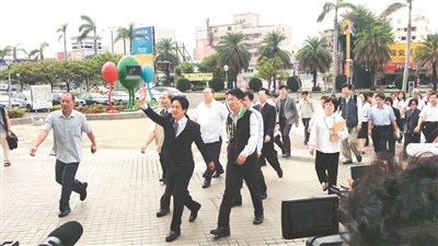 台南市長賴清德(左)上午舉行記者會宣告「掃除黑金已看見曙光」,踏入台南市議會備詢。圖/曹馥年