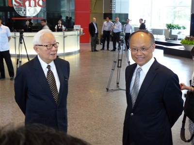 台積電認購綠電1億度,經濟部長鄧振中(右)今天率領能源局長林全能與台電總經理朱文成拜訪台積電,感謝台積電對再生能源發展的貢獻,台積電董事長張忠謀(左)親自出面接待。圖/中央社