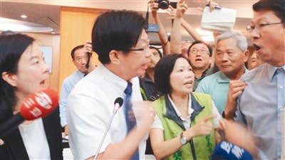 謝龍介怒摔施政報告,走到郭國文旁理論,兩人對罵,其他議員見狀,趕緊上前拉開,避免肢體衝突。