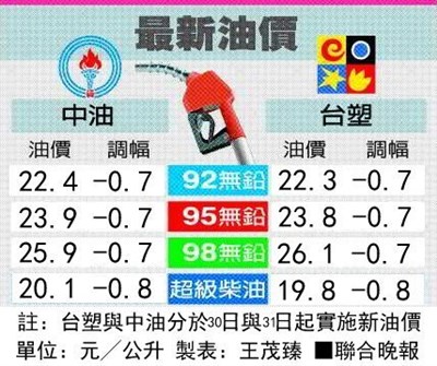 中油指出,雖然近日國際油價反彈,但全周跌幅仍深,本周國內油價有感降價;本周中油牌價分別是92無鉛22.4元、95無鉛23.9元、98無鉛25.9元、超級柴油20.1元。
