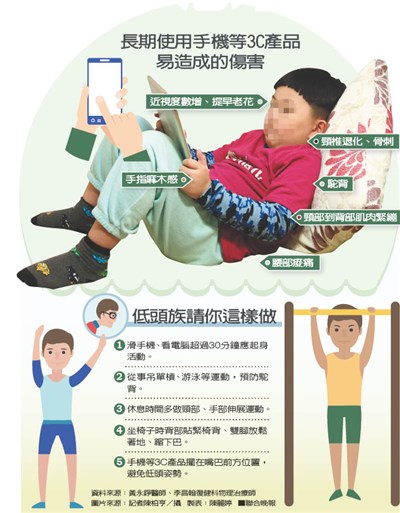 長期且過度使用手機等3C產品,除導致眼睛傷害外,臨床陸續收治不少因低頭或長時間姿勢不良不停上網、傳LINE,導致頸部、手部痠痛。