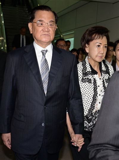 中國國民黨前主席連戰(左)偕同夫人連方瑀(右)今日搭機前往北京,將出席北京九三閱兵典禮。圖/中央社