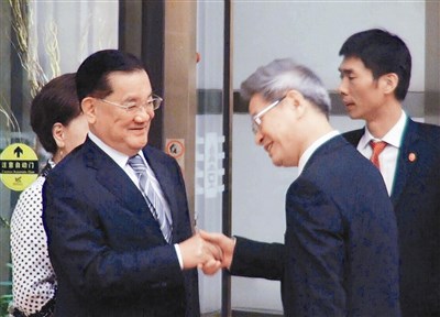 前國民黨主席連戰(左)昨晚抵達北京,入住北京飯店。中國大陸國台辦主任張志軍(右)在飯店大廳迎接,並設宴款待。圖/中央社