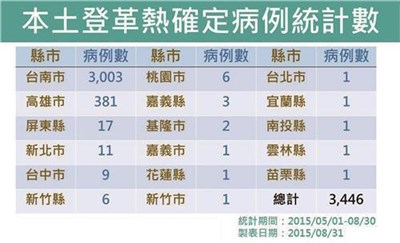 據疾病管制署從今年5月1日至8月31日最新本土登革熱確定病例統計顯示,台南市已累計3003例病例,其次是高雄市的381例,其他是屏東縣17例、新北市11例等,全台共有3446例。