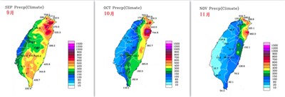 【本報台北訊】台灣近一周持續降雨,氣象局表示台灣受西南氣流的影響,各地皆有降雨甚至瞬間大雨的出現,氣溫也偏涼。氣象局預報主任鄭明典也用3個月的雨量圖指出秋季各地降雨的分布與走勢。