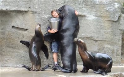 最近網路上流傳一段名為「Sea Lion Feeding and Kissing」(海獅的餵食和親吻)影片。國外一間動物園的海獅飼養員,正要拿桶子裡的魚餵海獅時,只見一隻隻海獅往飼養員奔去,其中一隻體型比飼養員龐大的海獅,相當熱情地黏著飼養員,並把他逼到牆壁送上香吻,不斷向他討魚吃。