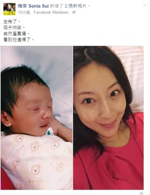 【本報台北訊】藝人隋棠今天在臉書表示,「生完了。母子均安。自然產真痛,看到他值得了」,隋棠也貼出兒子Max的照片,小姑謝沛恩也說,「超替他們開心,看到照片那一刻,很像是在作夢。」