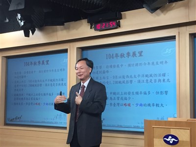 氣象局今天舉行說明今年秋季天氣展望。鄭明典表示,今年秋天因強聖嬰持續發展,台灣以略暖、少雨機會大。颱風以中颱發生頻率偏多,但影響台灣機率偏少,可能還會有1個颱風侵台。