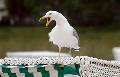 根據最新的研究顯示,2050年時,全球將有99%海鳥誤食塑膠,生命堪虞。圖為波羅的海的德國呂根島,一隻海鷗站在塑膠海灘椅上棲息。圖/美聯社