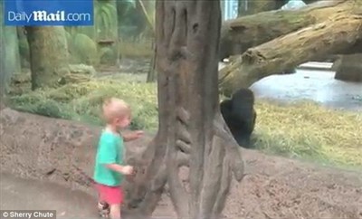 根據英國《每日郵報》報導,日前男童以賽亞(Isaiah Chute)與他的母親經過猩猩園區時,母親問以賽亞:「大猩猩會做什麼?」可愛的以賽亞立刻模仿猩猩的搥胸動作,沒想到這個舉動引起展示窗裡黑猩猩的興趣,兩人隔著玻璃及柱子玩起捉迷藏。