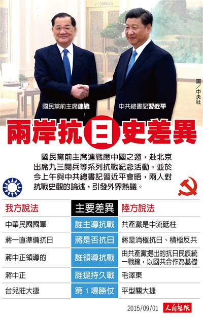 兩岸抗日史差異 |2015.09.01 語音朗讀 881觀看次 字級 大 中 小 國民黨前主席連戰應中國之邀,赴北京出席九三閱兵等系列抗戰紀念活動,並於今上午與中共總書記習近平會晤,兩人對抗戰史觀的論述,引發外界熱議。 前一篇文章 法國新公民課上路 強調反歧視 下一篇文章 研究:睡眠不足 感冒機率高4倍 熱門新聞 01最大規模無王日 逾3200場反川示威2026.03.3002美首批陸戰隊抵中東 地面戰在即2026.03.3003宜蘭綠博會 探索真理2026.03.3004陸首都維安 北京全面管制無人機2026.03.3005MLB 鄧愷威轉隊太空人 初登板奪首勝2026.03.3006乾旱嚴峻 雲林古坑春茶產量腰斬2026.03.3007北韓強化戰略武器2026.03.3008拉斐爾壁畫2026.03.3009昆士蘭協會 榮獲洛根市文化影響力獎2026.03.3010剛果文化壁畫2026.03.30 訂閱電子報 台北市 天氣預報 台灣一週天氣預報 相關報導 【星雲大師如是說】處事禪心【星雲大師如是說】人間佛教【星雲大師如是說】正信之美【星雲大師如是說】輪轉相繼【星雲大師如是說】有情的層次【星雲大師如是說】六忍歌