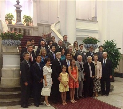 美國3位前總統羅斯福、杜魯門及艾森豪後代,近日來訪參加紀念抗戰活動,2日美國在台協會(AIT)在臉書上貼出眾人與總統馬英九(2排右5)合照,顯見美方重視。圖/AIT提供