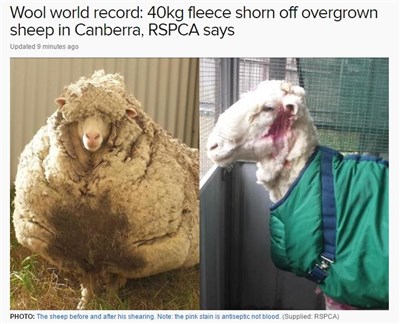 澳洲發現1隻迷路的綿羊,牠可能是活到目前為止首次剪毛,剪毛師表示剪下的毛共42公斤重。圖/取自網路