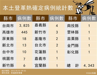 登革熱疫情持續延燒,衛福部申請第二預備金,動用3000萬元協助台南市政府防治登革熱。圖為台灣各地登革熱確定病例統計數。圖/中央社