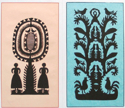西方剪紙主要表現事物的自然形態,注重外觀輪廓的剪影,不需暗存寓意,此為與中國剪紙差異處。因此西方剪紙創作題材比較廣泛,手法寫實,作品近似版畫。本館此次國外剪紙包括有日本、泰國、波蘭、俄羅斯、印度、美國、瑞士、德國、丹麥、以色列、墨西哥等十七個國家。