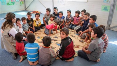 目前約有260 萬名敘利亞兒童由於戰亂長期失學,世展會「難民兒童教育方案」培訓難民中的知識份子成為老師,提供場地、交通車接送、學用品等,幫助孩子們恢復學習