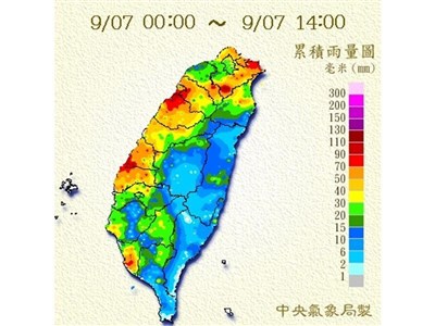受鋒面影響,7日全台有雨。圖為累積至下午2時的雨量圖。圖/氣象局網站