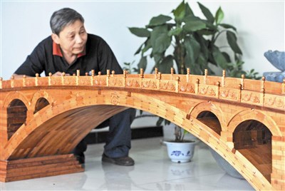 中國大陸河北趙縣農民張金現利用七千多塊香椿木,製作一座「迷你版趙州橋」。該橋長兩公尺多,寬、高都是四十多公分,橋身各部件排列緊密,所有立柱、欄板、腰釘大小統一,連橋面欄板上雕刻的花紋都和真實版趙州橋上的花紋一樣。趙州橋又稱安濟橋,因橋體全部用石料建成,俗稱「大石橋」。圖為張金現查看作品。圖/中新社