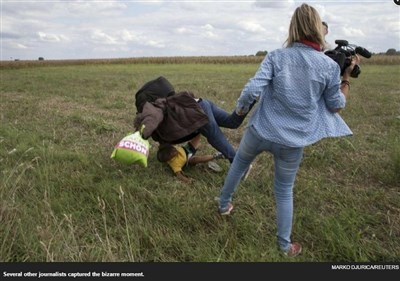 有名匈牙利的女記者名叫拉茲洛(Petra Laszlo),是網路電視台N1TV的攝影記者。當時她就站在人群中拍攝難民逃亡的情況,沒想到這名記者卻突然伸出左腳將難民絆倒,之後又看到她動腳去踹一名小孩。