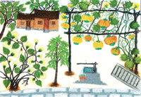 「我最喜歡苦味……」池塘邊的蓮花,山後的狼和狐狸,破舊的老房子,門前的枯樹……每一幅畫都記載了農村的苦味。常秀峰的蠟筆能調和出土地的味道,大膽的線條和色調,給人淒美的感覺。