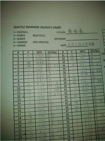 雨山隊播報員克托(Mike Curto)經由推特貼出了這張記錄紙,只見王建民在投手名字這欄寫下「奧爾森」,指的是「Tylor Olson」,比賽日期為「九月七日二○一五年」,就連球速都一律以中文記錄,像是「八十七」、「八十八」。