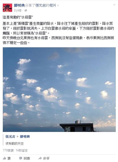昨天許多民眾的臉書被雲大洗版,出現一系列高積雲的照片,藝人隋棠也在臉書上PO文稱是天空攝影大賽,歡迎分享美麗天空。氣象局預報中心主任鄭明典一早也趕上這股風潮,在臉書上貼出一張水母雲的照片,雲的尾端細細的,看起來很水母有幾分相似。