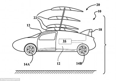 豐田公司的飛行車設計圖顯示,四個旋轉機翼是上下折疊式地裝在汽車的頂部,只要按動鈕,就可分別或全部伸出。