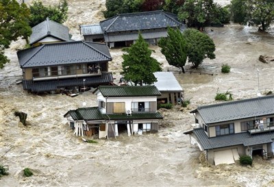 日本放送協會(NHK)出動直升機拍攝到茨城縣常總市的一座小鎮因鬼怒川潰堤,城鎮遭滾滾濁流侵襲的畫面。許多房舍、汽車被濁水沖走。