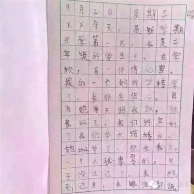 小男孩寫道「今天,是新學期的第一天,我是二年級的學生了,在學校,有一件傷心事。我的一個好同學轉學了,我非常傷心,因為她每天跟我玩,跟我聊天,我們約定好長大結婚的。」