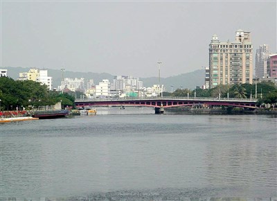 愛河出海口到真愛碼頭一帶,正進行拱橋工程,水面上有構台,台面上有怪手、吊車等,忙著施工,捷運局預計下月可以進行吊拱,屆時輕軌三拱橋將會成形。
