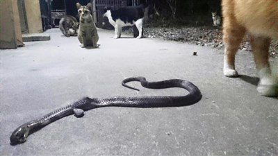 「慶幸沒跑到屋內」,女子說,她和男同事研判,這條「眼鏡蛇王」想闖入屋內,被群貓發現擊敗,還好有這群「護衛軍」;她說,這群貓是1、2年前協會收養的流浪貓,想到牠們「奮勇和眼鏡蛇搏鬥的畫面,就很心疼,還好都沒受傷」。