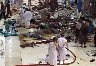 倒塌的塔吊砸破麥加大清真寺,造成數百人死傷,現場一片混亂,許多傷者身上血跡斑斑。圖/美聯社