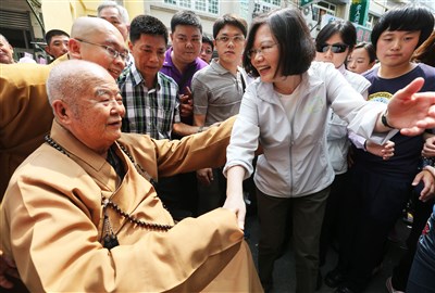 民進黨總統參選人蔡英文(右)上午到高雄橋頭參加余陳月瑛紀念館開幕典禮,並與佛光山開山星雲大師(左)會面。圖/劉學聖