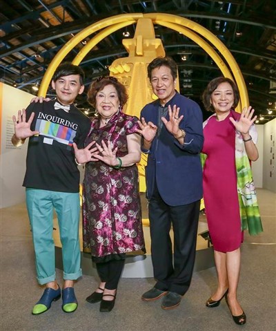 「金鐘五十˙響」特別展開幕記者會,導覽黃子佼、金鐘獎特別貢獻獎得主周遊、李朝永夫婦、廣播主持人方笛(左至右)在展場金鐘前合影。圖/取自網路