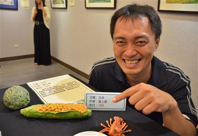 30年前藝術家林建成在台東東海國中當美術課老師,留下當時學生紙黏土作品,透過網路,找到作品主人。「玉米」是現任台東縣縣永安國小校長溫上德的作品。圖/中央社