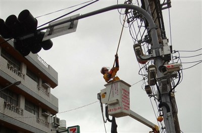 台電工程人員颱風天為搶修電力。 圖/台電公司台中區營業處提供