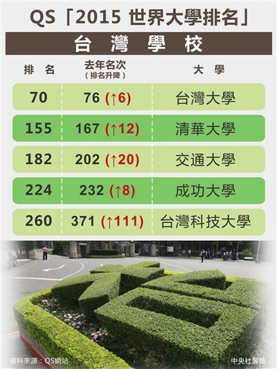 根據QS排名結果,台灣學校排名進前400名的的大學共9所,依序是台大70名、清大155名、交大182名、成大224名、台科大260名、陽明338名、台師大376名、中山大學379名、中央大學397名;以台大排名70名表現最優, 台科大排名260名,比去年進步111名最多。