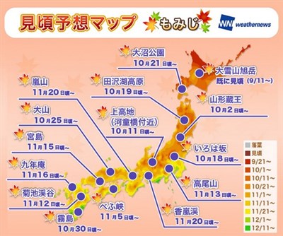 【本報台北訊】秋天腳步近了,日本最具指標性的Weathernews公布2015首波紅葉情報,今年北日本紅葉時間將與往年差不多,大雪山旭岳現在就能看見紅葉,而東日本、西日本的紅葉時間,受到氣溫的影響,預計看到楓紅的時間較去年來得晚。