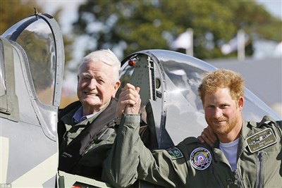 英國哈利王子(右)讓出位置,讓高齡95歲的老飛行員尼爾(左)能夠參與「不列顛戰役」75周年紀念活動。圖/取自網路