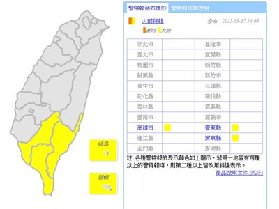 注意!高屏、台東發布大雨特報 |2015.09.17 語音朗讀 943觀看次 字級 大 中 小 中央氣象局表示,由於午後對流雲系發展旺盛,今日高雄地區、屏東地區及台東地區有局部大雨發生的機率。圖/中央氣象局 【本報台北訊】中央氣象局今天表示,午後對流雲系發展旺盛,高雄地區、屏東地區及台東地區有局部大雨發生機率,注意瞬間大雨、雷擊、強陣風及溪水暴漲;台南地區也有局部較大雨勢發生機率,也請民眾注意。 前一篇文章 陸大學體罰新招 「蓋棉被曬太陽」 下一篇文章 好肥!1顆廣式雙黃月餅=3碗白飯 熱門新聞 01法華禪寺深化宗教交流 拜會斯里蘭卡駐法大使2026.01.1602告急! 全台血庫剩5.3天 O型最缺2026.01.1603全球共讀《傳燈錄》 人間佛教雲端點燈2026.01.1604【生活快門】環保地球儀2026.01.1605【時光重逢】心裡有荷‧李蕭錕書畫照見初心2026.01.1606安心過年 海天佛剎送暖福田戶2026.01.1607大腦發炎易引發焦慮 吃莓果橄欖油助修復2026.01.1608舞獅躍動 馬德里佛青展現所學2026.01.1609【翻轉人生】修好機車 修好人生2026.01.1610【女子生活學】月亮忘記了2026.01.16 訂閱電子報 台北市 天氣預報 台灣一週天氣預報 相關報導 【星雲大師如是說】處事禪心【星雲大師如是說】人間佛教【星雲大師如是說】正信之美【星雲大師如是說】輪轉相繼【星雲大師如是說】有情的層次【星雲大師如是說】六忍歌