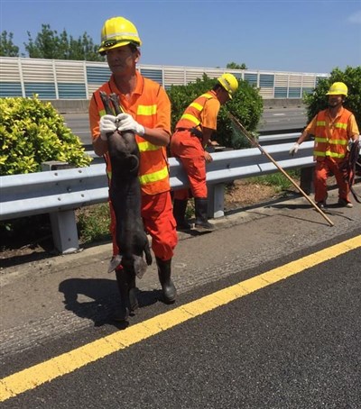 小黑豬闖國道,工程人員趕緊跑到中線分隔島,一把抓住小豬兩條後腿,完成「救豬任務」。圖/取自網路