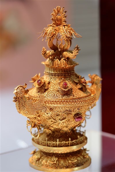 史博館指出,鎏金銀器工藝利用金、銀高度延展特性,先加熱後拉成細絲,再彎曲出花樣焊接於器物表面,稱為掐絲。若將細絲絞、扭成股,製成花絲加以編織,或層層盤繞堆疊,經焊接後連結成形,即為累絲。最後在累絲的器物上鑲嵌寶石,就稱為花絲鑲嵌。中國早在商朝就開始使用黃金,至戰國時期鎏金技術已發展成熟。唐代與西方文化交流之下,金銀器的器形與紋飾更是豐富多元。至明、清時細膩的花絲工藝發展,與五彩斑斕的寶石鑲嵌結合,把金細工藝推至「花絲鑲嵌」的絢爛極致。