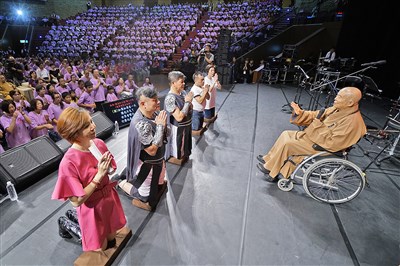 星雲大師親自主持皈依典禮,除了鐵獅亮光樂團團員外,也邀請欲皈依的民眾一起共襄盛舉。大師勉勵皈依信眾,要皈依真理、皈依自己;皈依後,猶如黑暗中有了光明、茫茫大海中有了慈航,並當場為澎恰恰提取皈依法名「本喜」、許效舜皈依法名為「本智」。