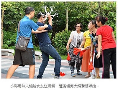 【本報綜合報導】大陸藝人汪峰2月用無人機送戒指向章子怡求婚,創意引起轟動。一名廣州年輕人日前則是將月餅券放在無人機裡送給在樓下等他的女友,沒想到被跳廣場舞的大媽「劫機」搶了月餅券。