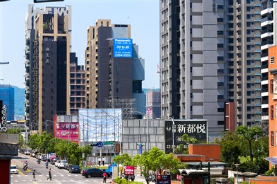 新莊副都心建案多,主要道路上可見大小廣告看板刺激買氣。圖/王騰毅