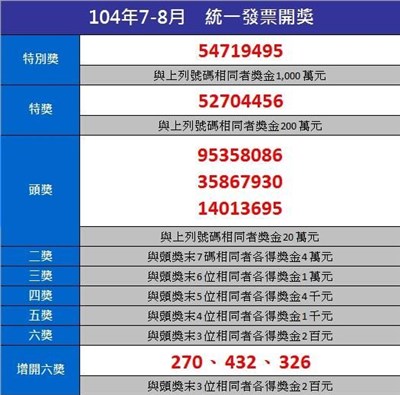 【本報台北訊】今年7、8月統一發票千萬元特別獎號出爐,特別獎號碼是54719495 ;2百萬元特獎號碼為52704456。