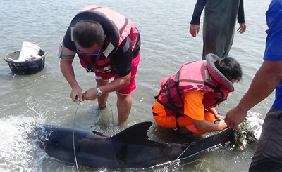 鯨豚尾鰭處略有小傷口,精神狀況不佳,且因當時正是退潮,擱淺處距海過遠,無法野放,因此海巡人員先將鯨豚身上纏繞的鐵絲漁網移除,蓋上被單並補充水分,避免脫水,下午3時左右,中華鯨豚協會人員抵達,研判該鯨豚種類為小虎鯨,身上並無重大傷口,因此計畫將該鯨豚運送至台南四草野生動物保護區鯨豚搶救站救援。
