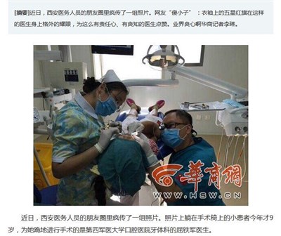 【本報綜合報導】大陸陝西省西安市一名牙醫日前為9歲女童動手術,為求精細40分鐘全程跪地。照片上傳到網路後被熱烈轉載,有網友說跪地是「最美姿勢」,稱這名牙醫是「業界良心」。